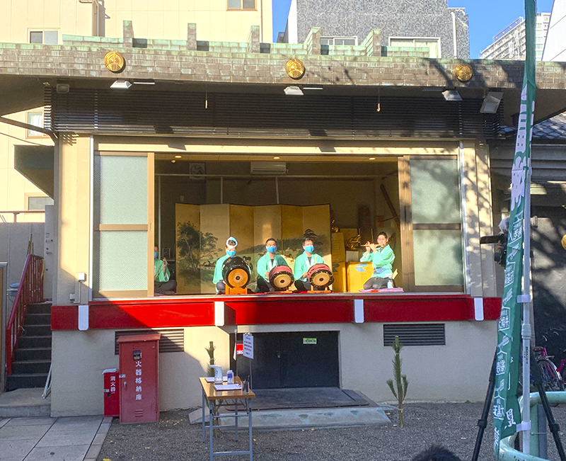 ▼23年元日の神楽殿ではお囃子が奏でられていました。